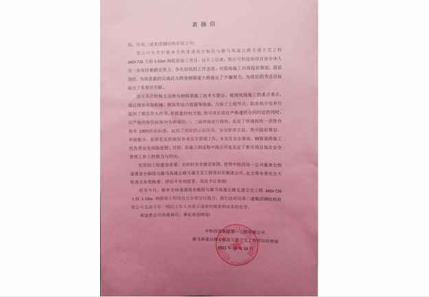 中铁四局集团第一工程有限公司向英皇体育(中国)体育官方网站发来表扬信